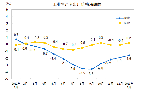 中新网2月8日电 据国家统计局网站消息,2013年1月份,全国工业生产者出厂价格(PPI)同比下降1.6%。