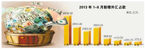 昨日,中国央行公布的8月金融机构人民币信贷数据显示,8月份外汇占款达到273915.92亿元,较上月增加273.2亿元。扭转连续两月负增长的局面。