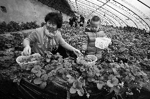 普通市民在大棚里采摘草莓。 郑贤摄