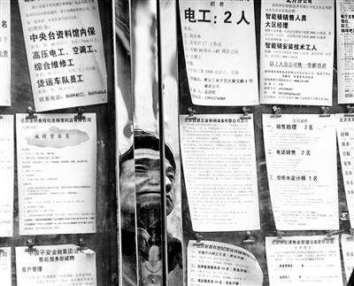下午1点,虎坊桥人才市场,因为场内并无招聘会,显得更为清冷。但场外的岗位栏却贴得满满当当。一栏一栏看过去,洗车工、餐厅服务员、西点师、保洁、业务员时时充盈眼间。“月薪2500元—4500元,包食宿不收取任何费用,每月15日准时发工资,入职上保险。”一家汽车服务公司招收洗车工的信息跃然纸上,还印上了大大的“急”字。