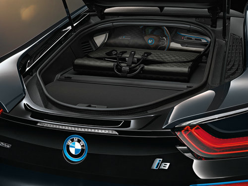 这套定制系列最奢华尖端之处在于采用了碳纤维复合材料,这种超轻又强韧的高科技材料能够经受长途旅行最严苛的考验。定制系列采用路易威登经典的方格图案,低调的碳黑色与BMW i8的车身颜色相得益彰。碳纤维内衬采用BMW i8的标志色彩——黑和电光蓝的颜色搭配,而细节处理上处处彰显路易威登的奢华品质。