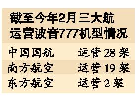 截至今年2月,中国国航运营28架波音777系列机型,南方航空公司19架,东方航空公司2架。目前各家航空公司开始转向777-300机型,国航订购了19架777-300ER,南航订购了10架,东航订购了20架,并于2014~2016年间交付。