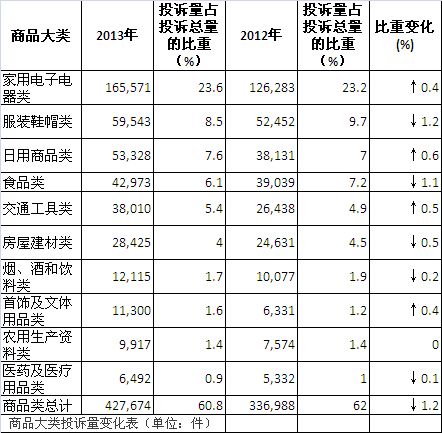 2013年商品大类投诉:家用电子电器类投诉量居首