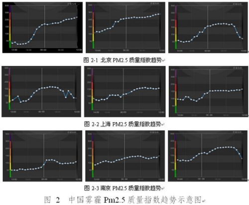 (2)中国“雾霾”强度在宏观上与大气污染物排放强度呈反向变化趋势,与欧美不一样。夜间,运行中汽车大幅减少、工厂停产、工地停工、发电厂负荷下降,大气污染排放强度降低,雾霾强度却显著增强;早上,生产生活恢复正常,污染排放强度提高,雾霾强度却呈稳定或下降趋势。这不是偶然现象,而是一般性规律,图2-1,2-2,2-3数据来自中国环保部。