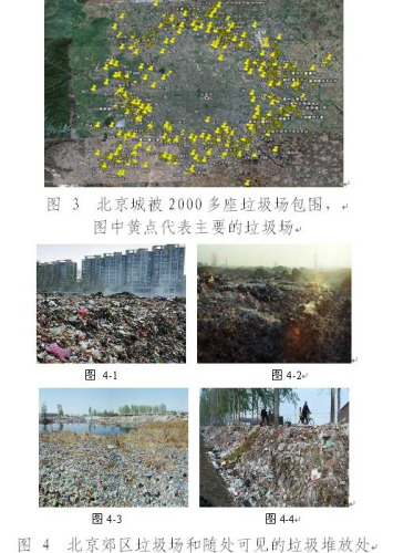 通过对气溶胶颗粒的成份进行DNA测序,发现1300多种微生物 。表明中国雾霾频发和严重性与我国东部地区水土环境面源污染、大量滋生微生物种群有直接关联。长期以来,我国经济发展方式粗放,产业结构和布局不合理,污染物排放总量居高不下。如北京已被2000多座垃圾场包围,每天垃圾处理缺口8000吨,仍以每年8-10%速度增长。见图3-4。面对严峻形势,我国加强土壤环境保护和污染治理,坚决向土壤污染宣战 。