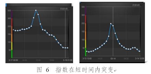 附着在气溶胶颗粒上的微生物在适宜条件下迅速繁殖,使气溶胶体积迅速增大,最终形成雾霾。如常温常压下,气溶胶颗粒只有0.1微米,但随微生物迅速繁殖,体积可迅速增长到2.5微米、5微米,甚至10微米。图6显示雾霾指数突变,左图最高点在中午12∶00附近;右图最高点在凌晨00∶00附近。按传统解释,指数高点应有污染突发性事故发生,但事实上并没有,这只能用微生物快速分裂解释。