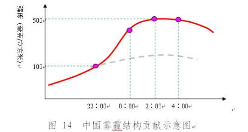 图14虚线为假设传统雾霾浓度发展趋势,实线为微生物、水分及氨氮作用下雾霾浓度发展趋势线。冬春季节夜间气象条件有利于水份蒸腾凝结和微生物繁殖,尤其冷空气南下造成空气水份加速凝结,极易形成严重雾霾;白天水分蒸腾作用随大气湿度增大而减弱,温度上升也使水分凝结作用减弱,使水分和氨氮减少,微生物活性减弱,雾霾强度下降。