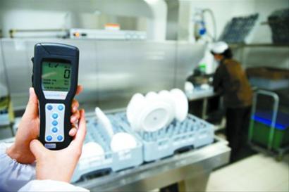 虽然电子溯源平台和“千里眼”技术先进,但无法面面俱到,替代不了现场监管,比如锅碗瓢盆的洁净度,还需要靠工作人员上门用手持式设备检查。工作人员向记者展示了一种自主研发、全球首创的 “ATP检测仪”,外形看上去像个刷卡的POS机,应用了物联网技术,植入信息单片,采用蓝牙和3G无线信息传输技术,可实现餐饮具环节表面ATP快速检测数据的自动实时传输。如果一个砧板表面的微生物残余量超标,具体的超标情况立刻就会传到食品安全指挥部的后台。