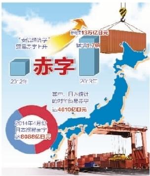 但是,许多日本经济专家仍认为,导致日本贸易赤字持续增加的直接“元凶”是“安倍经济学”。安倍上台后的金融对策一直坚持通过大规模量化宽松政策,诱导日元贬值,为企业出口创造有利条件。然而,日元贬值的结果却出乎日本政策当局的预料,不仅出口增长缓慢,进口增长却异常迅猛。从近10个月的统计看,进口增长约在20%左右,远远超过出口增长。其中,原油和天然气等燃料产品占主要部分,其次是手机、电脑及服装等。据调查,上述产品的进口量并没有明显增加,但由于日元大幅贬值,以日元计算的进口额就显得很高。结果就是,“安倍经济学”给日本带来了与日俱增的贸易赤字。
