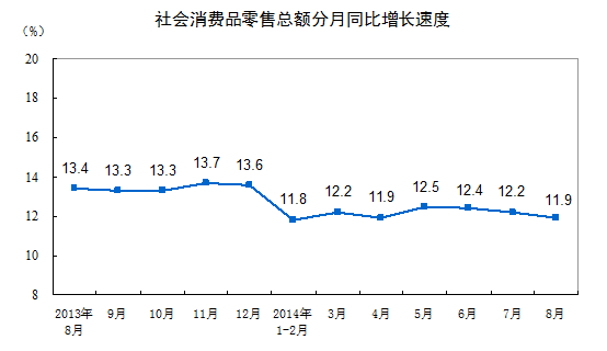 参与互动(0)新华网消息 据国家统计局网站消息,国家统计局今日公布的数据显示,2014年8月份,社会消费品零售总额21134亿元,同比名义增长11.9%(扣除价格因素实际增长10.6%,以下除特殊说明外均为名义增长)。其中,限额以上单位消费品零售额10466亿元,增长9.0%。1-8月份,社会消费品零售总额166108亿元,同比增长12.1%。其中,限额以上单位网上零售额[1]2506亿元,增长54.9%。