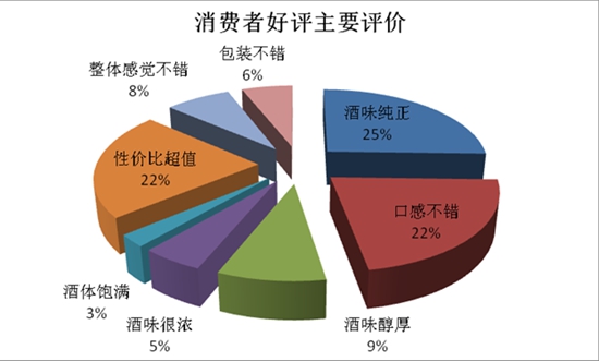 《报告》产品好评维度中,消费者好评主要以罐装啤酒为主。从数据中可以看出,来自网民关于啤酒的评论主要集中在关于啤酒质量、价格和外观等三个方面,其中对于酒味纯正(厚)、口感不错和性价比超值的啤酒较受消费者的认可。