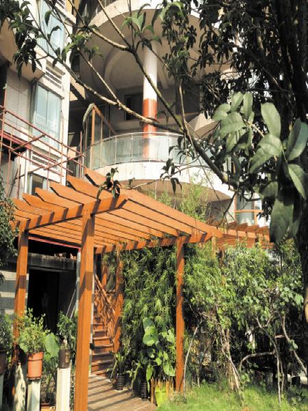 记者昨日上午围绕湘江世纪城湘江豪庭小区7栋走了一圈,发现楼栋东南角搭起了许多木质建筑,非常显眼,圆弧形墙面都装上了玻璃,在离楼栋几米远的地方还有木质亭子和水池。一名业主告诉记者,这些都是一楼某位业主私自搭建的,想将公共绿地变成私人花园。
