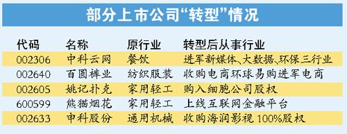 实际上,中科云网只是众多转型上市公司中的一员。随着经济结构调整的进行,上市公司“跨界转型”愈发密集。