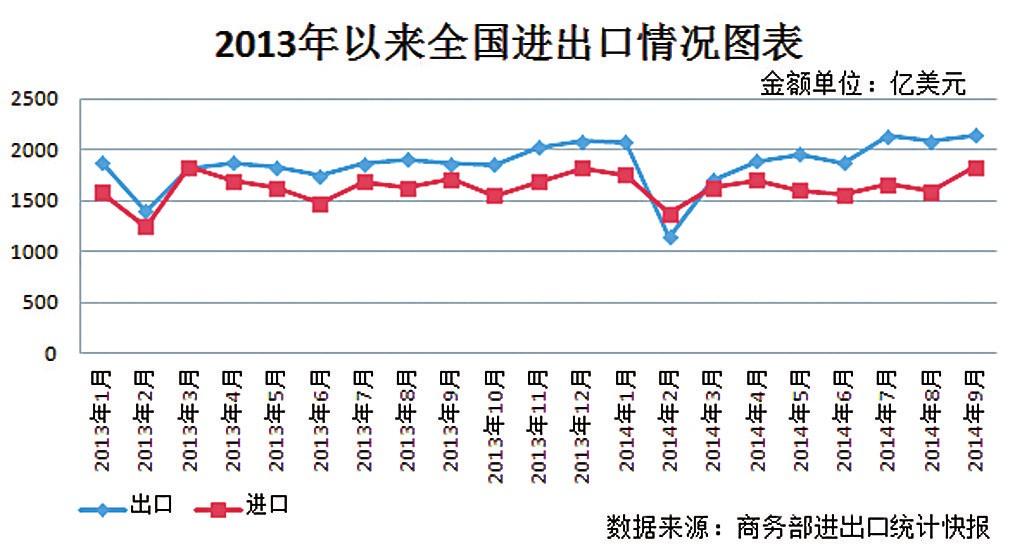 来自海关的统计数据显示,2014年9月,全国进出口24417亿元,同比增长11.2%。其中,出口13159亿元,增长15.1%;进口11258亿元,增长6.9%;顺差1901亿元,增长1.1倍。9月出口增速15.1%的速度,创下了19个月来的新高。沈丹阳看来,这个增速是正常的。9月份的全国进出口同比增长15.3%,增速比上个月加快了5.9个百分点。这既得益于外贸稳增长政策措施的见效,也得益于国际市场需求的回暖。