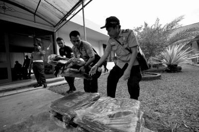 12月30日,在印度尼西亚邦加槟榔机场,搜救队成员整理尸体袋。新华社发