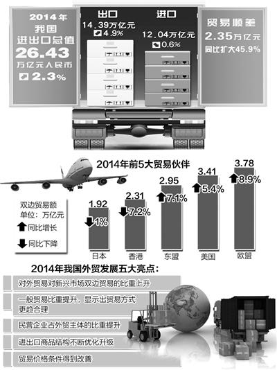 “从单纯的数据规模来看,2014年我国贸易顺差又制造了一个新的高点,但简单的高顺差并不是我国对外贸易所追求的目标,我们一直在关注对外贸易的平衡、协调和可持续发展。”郑跃声说。