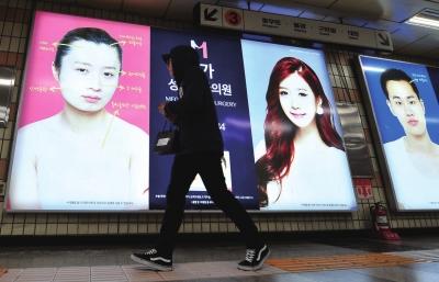 2014年3月26日,韩国首尔地铁站内,一名行人从整容广告牌旁经过。