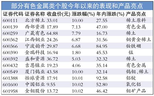 受此影响,有色金属类个股大幅上涨,截至收盘,有色金属平均涨幅3.55%,成交量826.5亿元,总成交量仅次于证券股(1378亿元)。其中,中国铝业、怡球资源、章源钨业、北方稀土、金钼股份、盛达矿业、章源钨业、宁波富邦、洛阳钼业等9股涨停。广晟有色、西部资源、驰宏锌锗、江西铜业、盛和资源等涨幅也都在5%以上。