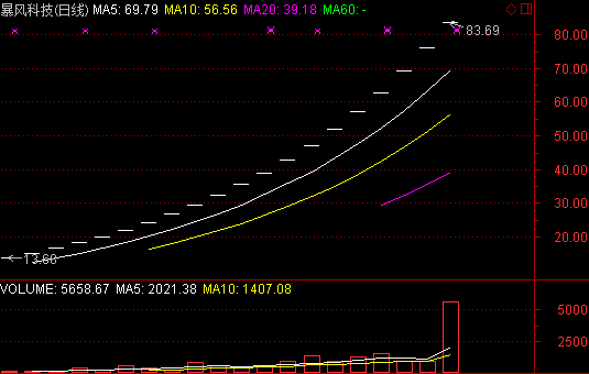 周五暴风科技涨停收报83.69元,继续刷新新股涨停板记录。该股自3月24日登陆创业板上市以来,走出连续23个一字涨停,市值突破百亿元。