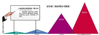 数据显示,截至5月22日,新三板挂牌公司共有2452家,总成交额18.9亿元。而在2014年上半年,新三板挂牌公司的数量为811家。也就是说,一年内,公司数量暴增了1641家,涨幅逾2倍。