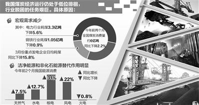 从宏观上看,随着我国经济进入新常态,宏观经济从高速增长进入中高速增长,国民经济对煤炭的需求量有所减少。据测算,今年前两个月,全国煤炭消费量约6亿吨,同比下降2.2%,其中电力行业耗煤3.3亿吨,下降5.6%;钢铁行业耗煤1.05亿吨,下降0.9%。3月份重点发电企业日均耗煤同比下降15.8%。