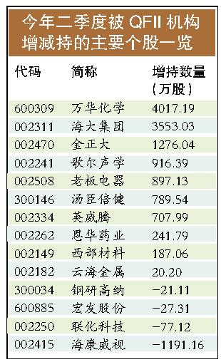 值得注意的是,随着上市公司中报陆续披露,QFII持股路线也开始暴露。记者获取的最新数据显示,今年二季度QFII集中增持了万华化学、海大集团、金正大、歌尔声学、老板电器等10家公司,其中,万华化学被科威特投资局增持了4017.19万股。但同期,QFII也大幅减持了海康威视1191.16万股。另外,联化科技、宏发股份、钢研高纳等部分个股也遭到QFII的减持。(广州日报记者张忠安)
