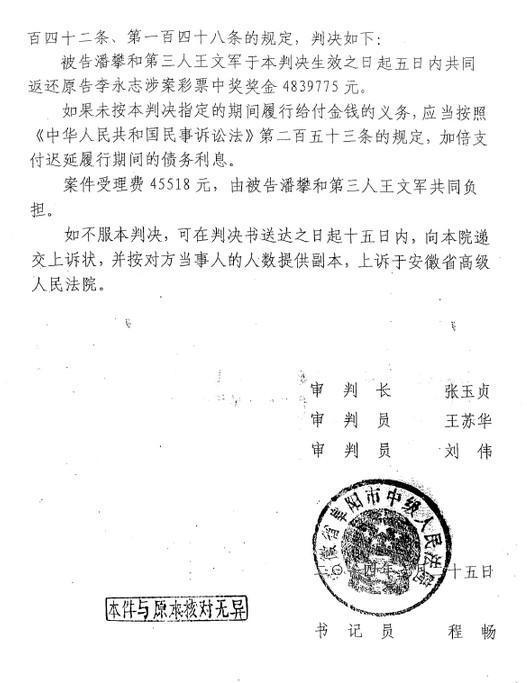 7月30日,李永志告诉澎湃新闻,本属他的彩票奖金被人冒领后,他将冒领者诉至法院。官司打赢后,但被告拒不执行判决。其中一名冒领者在诉讼期间,就已将奖金从银行取走,目前下落不明。
