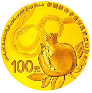 7.776克(1/4盎司)圆形金质纪念币背面图案以象征各民族团结和谐的石榴图案为主体,衬以少数民族特色“艾德莱斯”构成“60”装饰造型组合设计,并刊“新疆维吾尔自治区成立60周年”汉、维文字样及面额。
