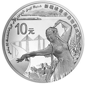 31.104克(1盎司)圆形银质纪念币背面图案为维吾尔族少女舞蹈形象,与丰收的果实、斜拉大桥、高速铁路、天山及风力发电等造型组合设计,并刊“新疆维吾尔自治区成立60周年” 汉、维文字样及面额。