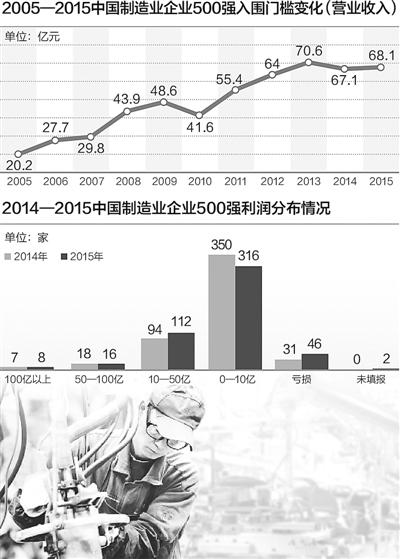 然而,制造业总体盈利能力未有大的改观,且亏损企业数量及亏损额均有增加。2015中国制造业企业500强去年共实现净利润5737.4亿元,比上年增长2.27%,增幅较上年下降了5.57个百分点。在这些制造业企业中,六成企业年利润额仅在10亿元以内,只有8家企业利润额超过100亿元。另有46家企业亏损,比上年多15家。