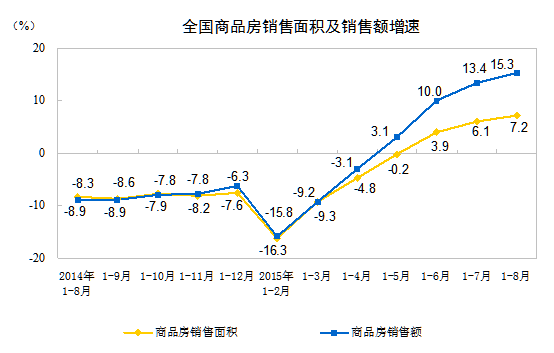 中新网9月13日电 国家统计局今日公布数据显示,2015年1-8月份,全国房地产开发投资61063亿元,同比名义增长3.5%,增速比1-7月份回落0.8个百分点。前8月,商品房销售面积69675万平方米,同比增长7.2%,增速比1-7月份提高1.1个百分点。