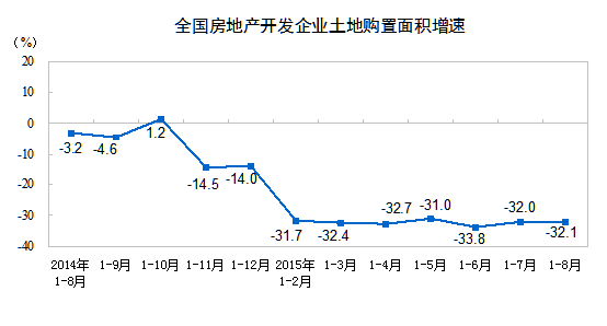 1-8月份,房地产开发企业土地购置面积14116万平方米,同比下降32.1%,降幅比1-7月份扩大0.1个百分点;土地成交价款4294亿元,下降24.6%,降幅收窄1个百分点。