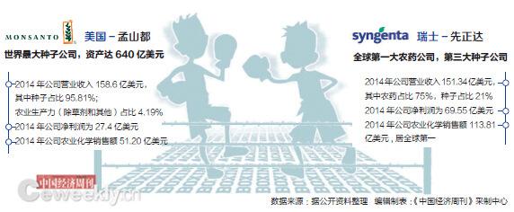 全球的农资产品市场被六家大企业控制着,分别是美国公司孟山都、杜邦、陶氏化学,瑞士公司先正达,德国企业巴斯夫和拜耳。孟山都和先正达体量相当,2014年年收入都在150亿美元左右。孟山都是全球最大的种子公司,而先正达则是全球最大的农业化工企业。若此次收购成功,六巨头将变为五家,将诞生一个农业领域的巨无霸。