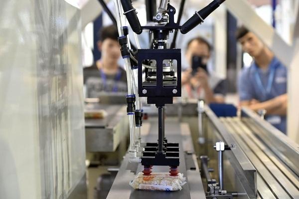 在佛山一个展览会上,人们正在观看机器人演示工作流程。图片来源:路透社