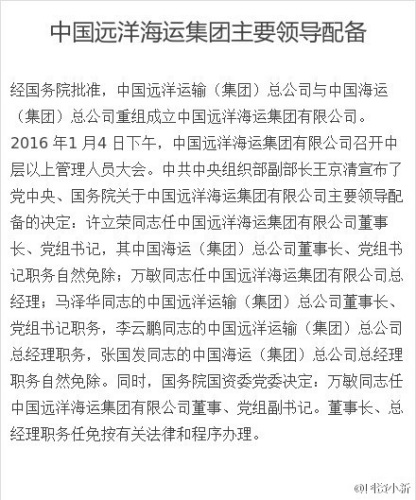 中新网1月4日电 据国务院国资委新闻中心微博“国资小新”消息,经国务院批准,中远集团与中国海运重组成立中国远洋海运集团有限公司。