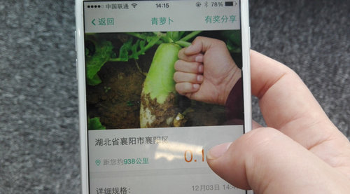 2015年5月,侯长春又遇到当地土豆出现卖不动的情况,于是便认真琢磨起帮农民卖农货的生意。一个偶然的机会,他用手机下载了一个叫“一亩田”的APP,看到各地农产品的供应信息和价格行情。侯长春立即意识到,襄阳沙地土壤种出的萝卜口感好,但价格远低于河南、山东等地,因此存在巨大市场空间。
