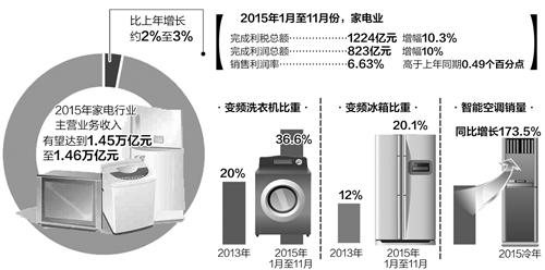 令人欣喜的是,2015年家电业整体效益增幅虽有所趋缓,但仍保持了较好的盈利水平。2015年1至11月份,家电业完成利税总额1224亿元,增幅10.3%;完成利润总额823亿元,增幅10%;家电全行业销售利润率6.63%,高于上年同期0.49个百分点,处于历史同期最好水平。