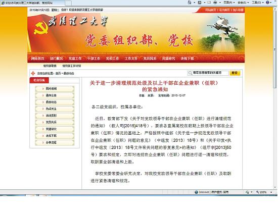 近日,教育部下发《关于对党政领导干部在企业兼职(任职)进行清理规范的通知》(教人司[2015]418号),要求各直属高校在前期上报领导干部在企业兼职(任职)情况的基础上,严格按照中组部《关于进一步规范党政领导干部在企业兼职(任职)问题的意见》(中组发〔2013〕18号)和《关于印发<执行中组发〔2013〕18号文件有关问题的答复意见>的通知》(组厅字[2013]50号)要求和规定,立即对违规在企业兼职(任职)问题进行逐一清理和规范,取酬要全部清退和上缴。