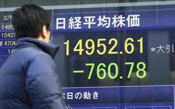 12日,东京街头电子屏显示,日经指数收盘跌破15000点,创下该指数15个月来最低。(日本《日经亚洲评论》杂志网站)