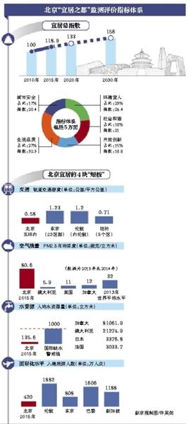 新京报记者了解到,在北京关于和谐宜居总指数的评定体系当中,“生活品质”的权重最高,具体指标涵盖市民的衣食住行。其中包括市民平均受教育年限、人均期望寿命、百名老人养老床位数、城镇居民人均住房建筑面积、轨道交通运营里程、中心城绿色出行比例等。同时,“生活品质”也成为2010年到2015年间,北京提升得最为明显、幅度最大的一部分内容。
