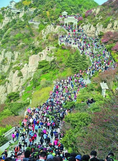 5月1日,泰山天街上挤满了徒步上山的游客。新华社发