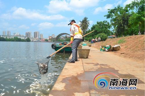 南国都市报5月5日讯(记者贺立樊) 5日下午,记者从海口市海洋和渔业局获悉,红城湖死鱼事件的调查报告出炉。由海入湖,无法在短时间内适应盐分的突然变化,是这群青鳞鱼死亡的直接原因。经 过两天的高强度清理,5日下午,红城湖的死鱼打捞工作已经接近收尾。湖面见不到成片的死鱼群,个别零星漂浮的死鱼被环卫工人一网接一网地捞入筐中。“昨天 (4日)一直打捞到晚上8点半,这时已经不具备打捞条件。”海口市京环城市环境服务公司作业部部长樊京虎介绍,5日上午发现死鱼量没有增加,说明已经没有 继续出现死鱼。“突击打捞工作已经结束,现在进入常态化作业,采取精细化工作。”樊京虎表示,成片的死鱼群已经没有了,但是仍有极少量死鱼漂浮,或是卡在 岸边石缝中。“要做的就是把这些遗留的死鱼进行排查清理,同时由于打捞死鱼作业的特殊性,有残留物落在地面上,因此需要出动清扫车洒水清理。”为了防止高 温天气下滋生细菌,环卫部门还在红城湖内播撒环保酵素,以及少量的消毒水。