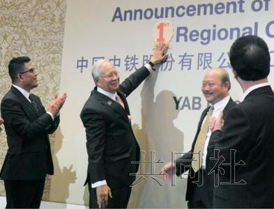 图为马来西亚总理纳吉布(左二)出席中国中铁“亚太总部”成立仪式,3月摄于吉隆坡。(共同社)