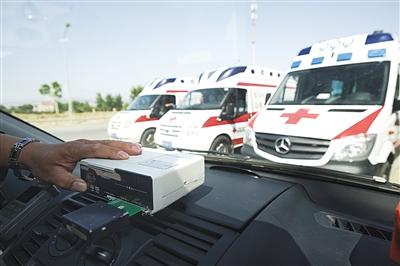 4月22日,工作人员在海淀一停车场展示如何检测救护车计价器。5月起北京救护车按载客里程收费。 新京报记者 王嘉宁 摄