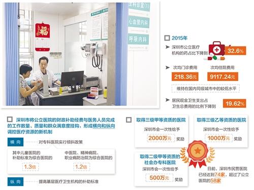 调动所有市场要素的积极性,推动社会力量办医,打造多元化办医体系,弥补卫生供给不足,是深圳市政府职能转变后的另一重要工作。取得三级甲等和三级乙等资质的医院,深圳市会分别一次性给予2000万元、1000万元的奖励,取得二级甲等资质的社会办专科医院,则一次性给予500万元奖励。社会办医疗机构提供的基本医疗服务纳入财政补助范围,年均对社会办医疗机构奖励补助约1.4亿元。目前,深圳市民营医院已经达到74家,超过了公立医院的58家。