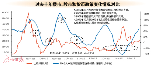 不过,广发证券首席策略分析师陈杰指出,2005年以来,房价回调存在一定的周期规律,如果在货币宽松周期下,房价下跌或对股市有利。在2008年9月和2014年5月,两次房价下跌都处于货币宽松周期之中,这期间股市一次先跌后涨、一次大幅上涨,背后不排除楼市资金流入了股市。2011年9月货币政策在不断收紧,使得房价下跌期内,楼市资金并没有回流股市,A股震荡下跌。“综上来看,未来可能导致房市资金流入股市的条件是:行政调控导致房价出现短周期下跌,且货币政策维持或者进一步宽松。”