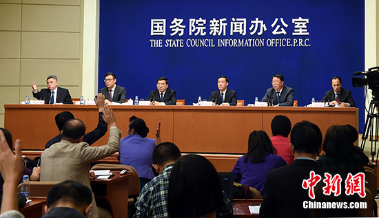 10月10日,国务院新闻办公室在国务院新闻办新闻发布厅举行新闻发布会,发展改革委副主任连维良、财政部部长助理戴柏华、人民银行副行长范一飞、国务院国有资产监督管理委员会副主任孟建民、银监会副主席王兆星介绍积极稳妥降低企业杠杆率有关政策情况,并答记者问。 中新社记者 张勤 摄