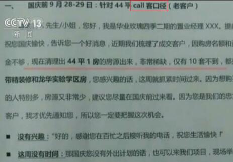 在检查“华业玫瑰四季”这个楼盘时,调查人员发现该楼盘售楼处,有专门向顾客电话推销而准备的“口径”,销售人员在推销楼盘时使用统一用语,比如“因购房名额和资金不够,现在清理出44平1房的房源出来,非常稀缺,仅有10套不到。”、又或“房源有限,随时可能会被别人买走”等等,但事实并非如此。