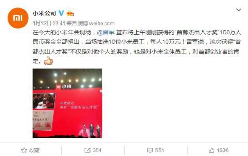 雷军在年会一边上宣布2017年整体营收过“1000亿”的小目标,一边把自己获得的100万“首都杰出人才奖”随随便便就捐出来了,注意是10名员工,每人10万!
