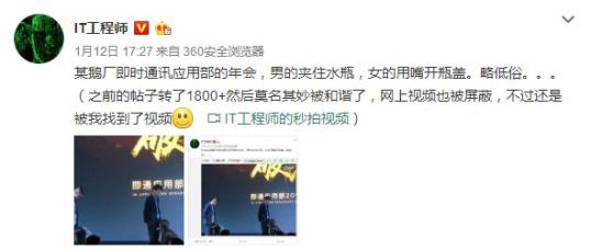 最近,腾讯即通应用部被曝出了年会低俗游戏的照片和视频,实在是“辣眼睛”。从网友曝光的照片中可以看到,男生双腿夹着矿泉水瓶,女生半蹲着用嘴打开瓶盖。这一组图片出来,不少网友表示游戏环节恶心、低俗、粗陋。